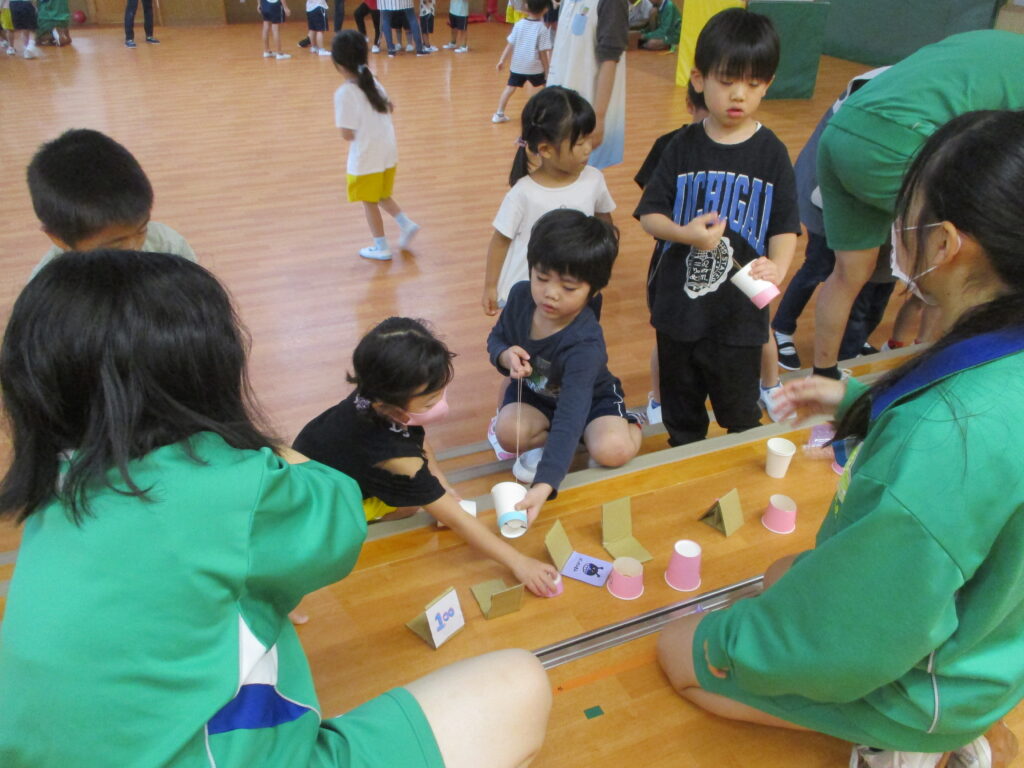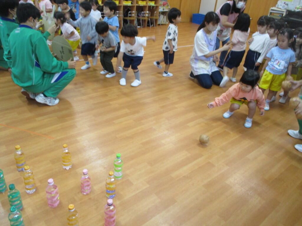 たくさん的に当たったり、ピンが倒れたりすると、お友達やお兄さん・お姉さんと喜ぶ姿があったり、